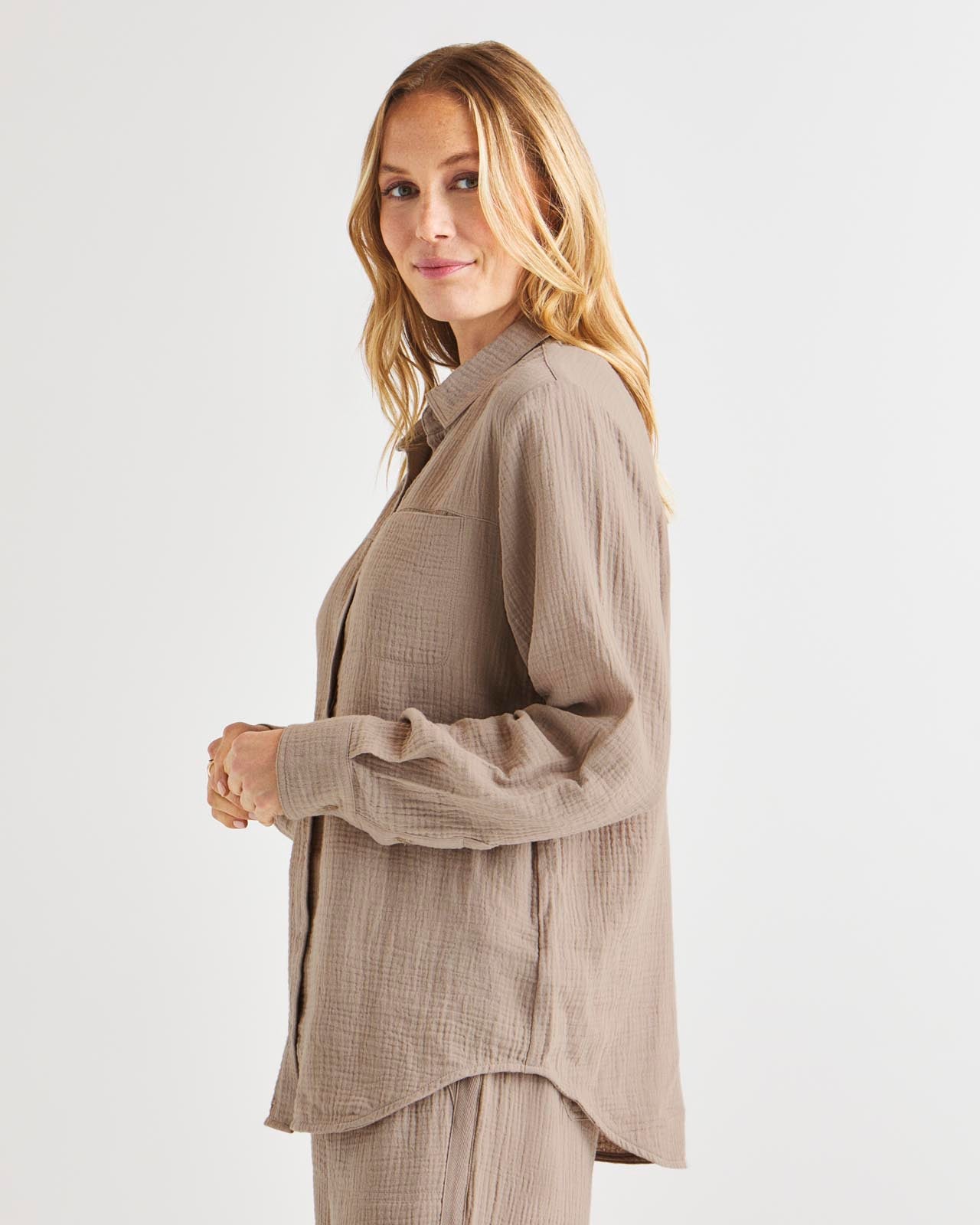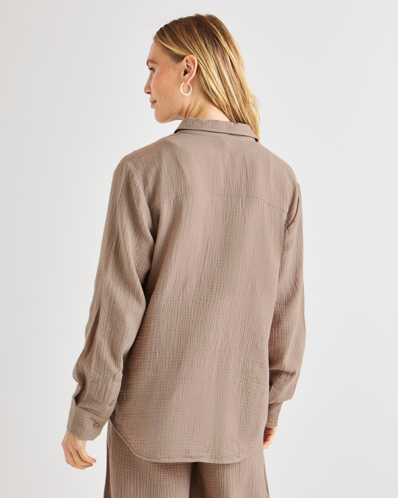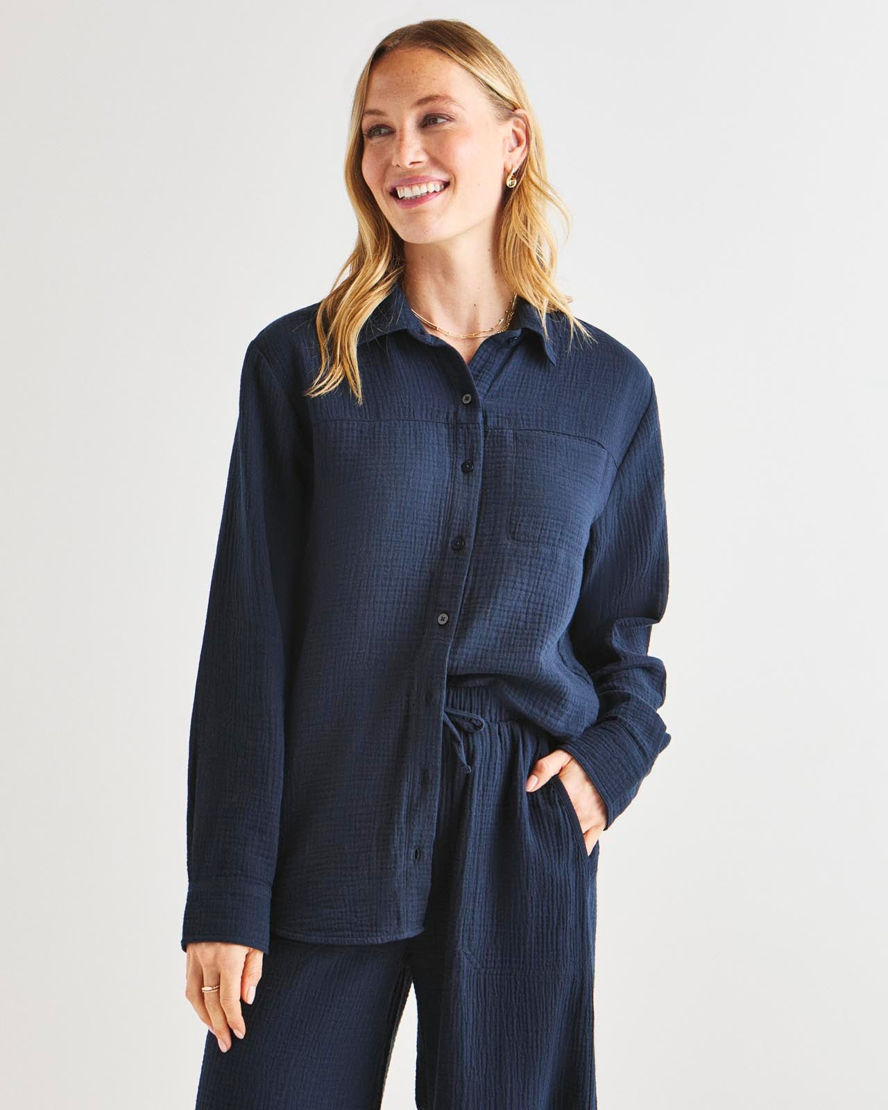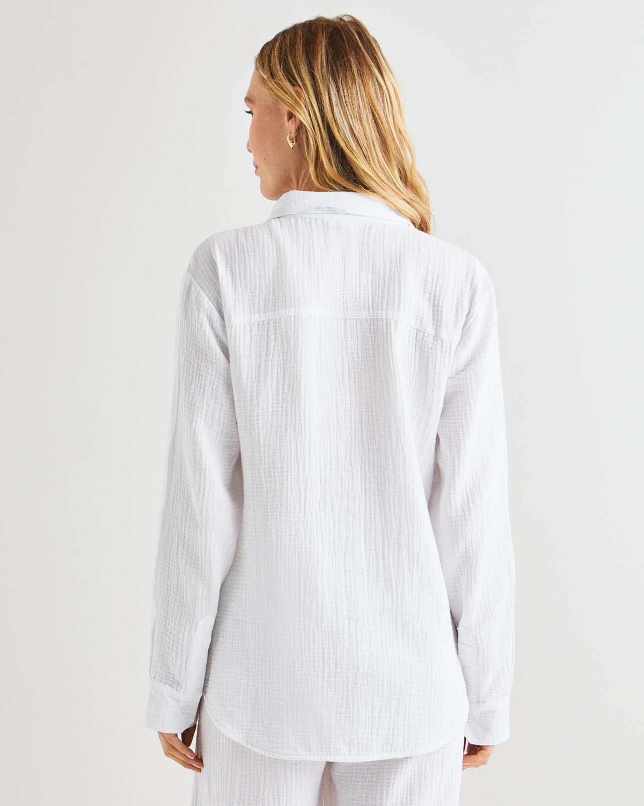 Soft and airy, our Kit Gauze Button Down Shirt is perfect for the warmer months. This lightweight shirt is made from a breathable cotton gauze in an easy fit silhouette for added comfort. We love to wear it open over a tank or tied in the front for added styling options. Pair with our Kit Gauze Palazzo Pant to create a matching set.