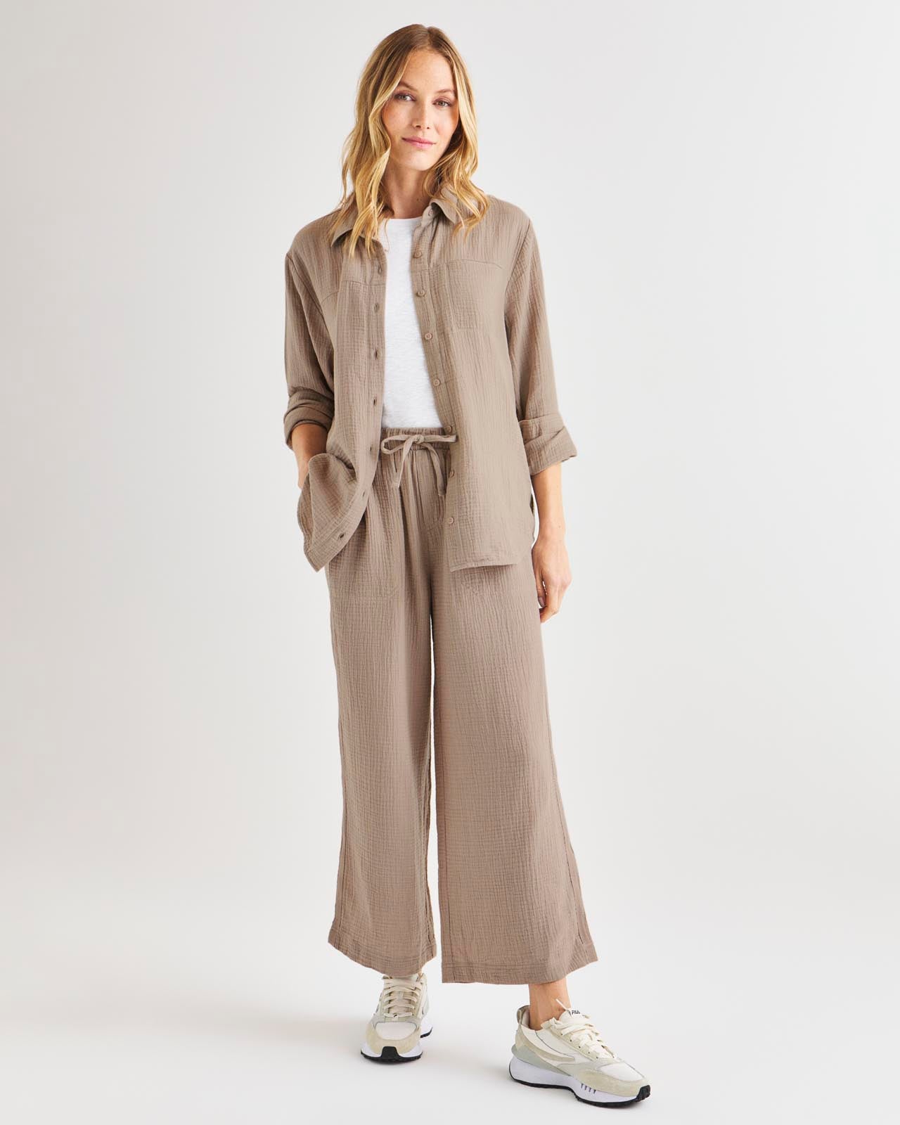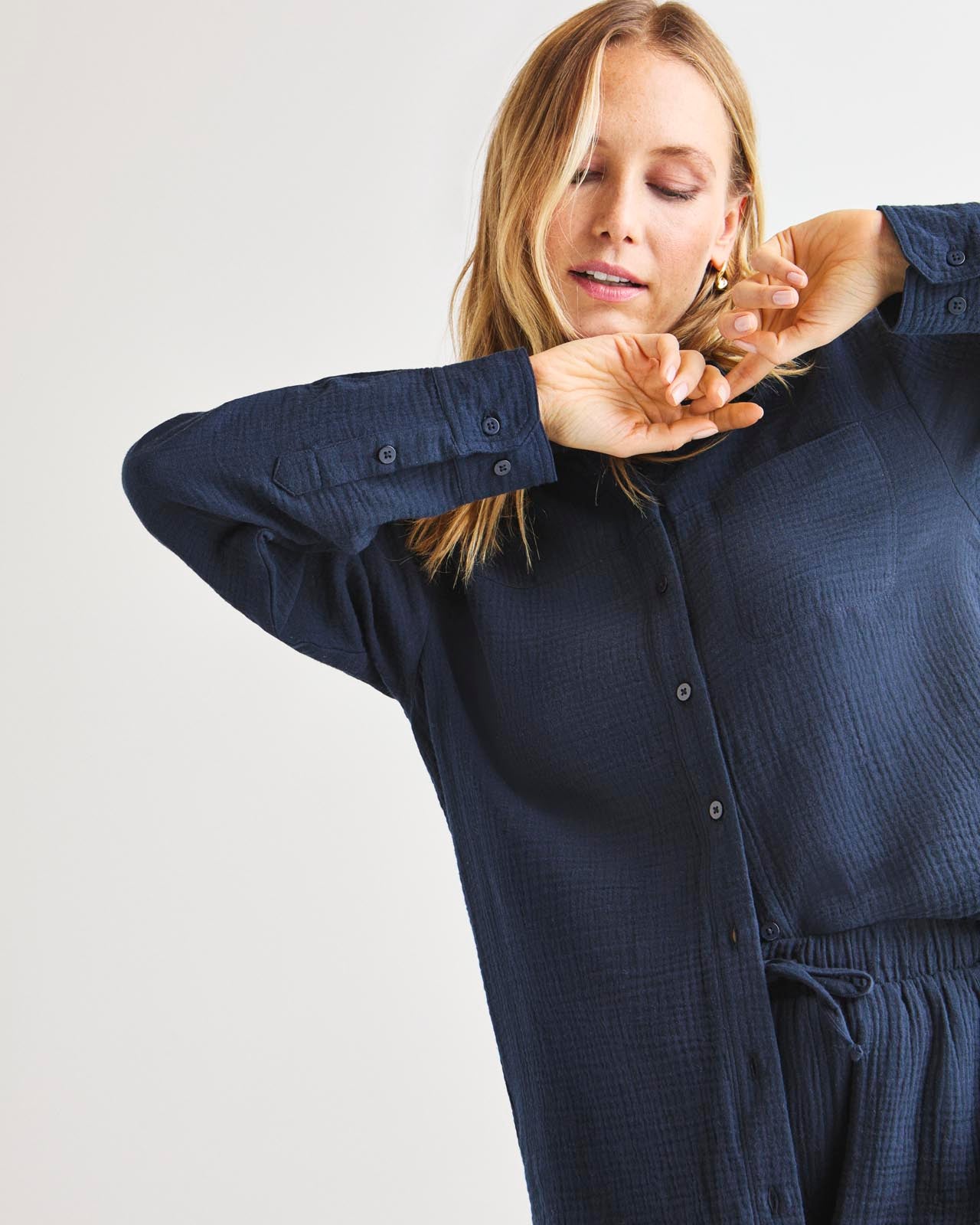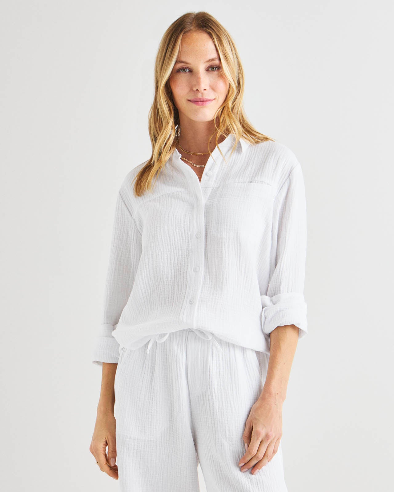 Soft and airy, our Kit Gauze Button Down Shirt is perfect for the warmer months. This lightweight shirt is made from a breathable cotton gauze in an easy fit silhouette for added comfort. We love to wear it open over a tank or tied in the front for added styling options. Pair with our Kit Gauze Palazzo Pant to create a matching set.