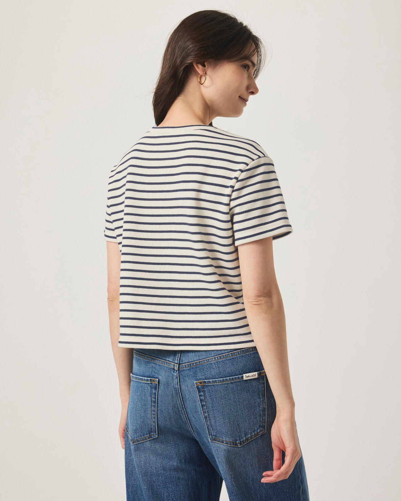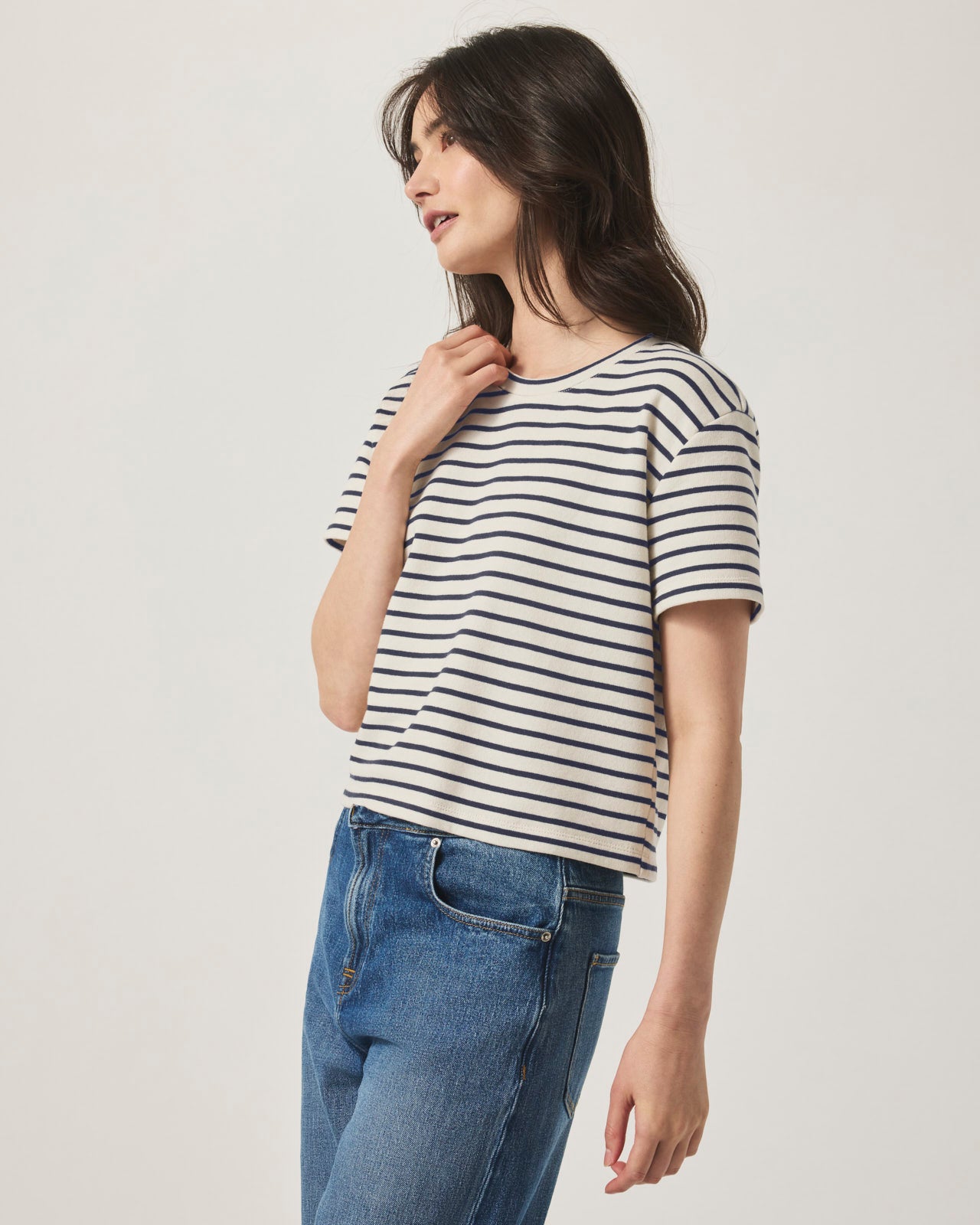 There’s something classic about our Whitney Stripe Tee. A never-goes-out-of-style stripe pattern is placed on a crewneck with a slightly cropped boyish fit that looks so good with your most-loved jeans– or paired with the matching Whitney Stripe Short.